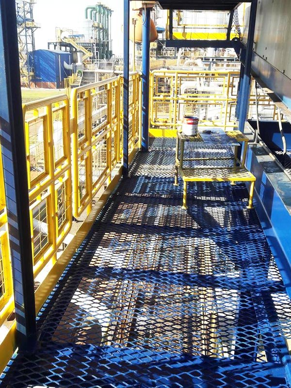 - Sandblasting para preparação de superfície removendo corrosão; revestimentos em múltiplas camadas (primer + intermediário + topcoat).